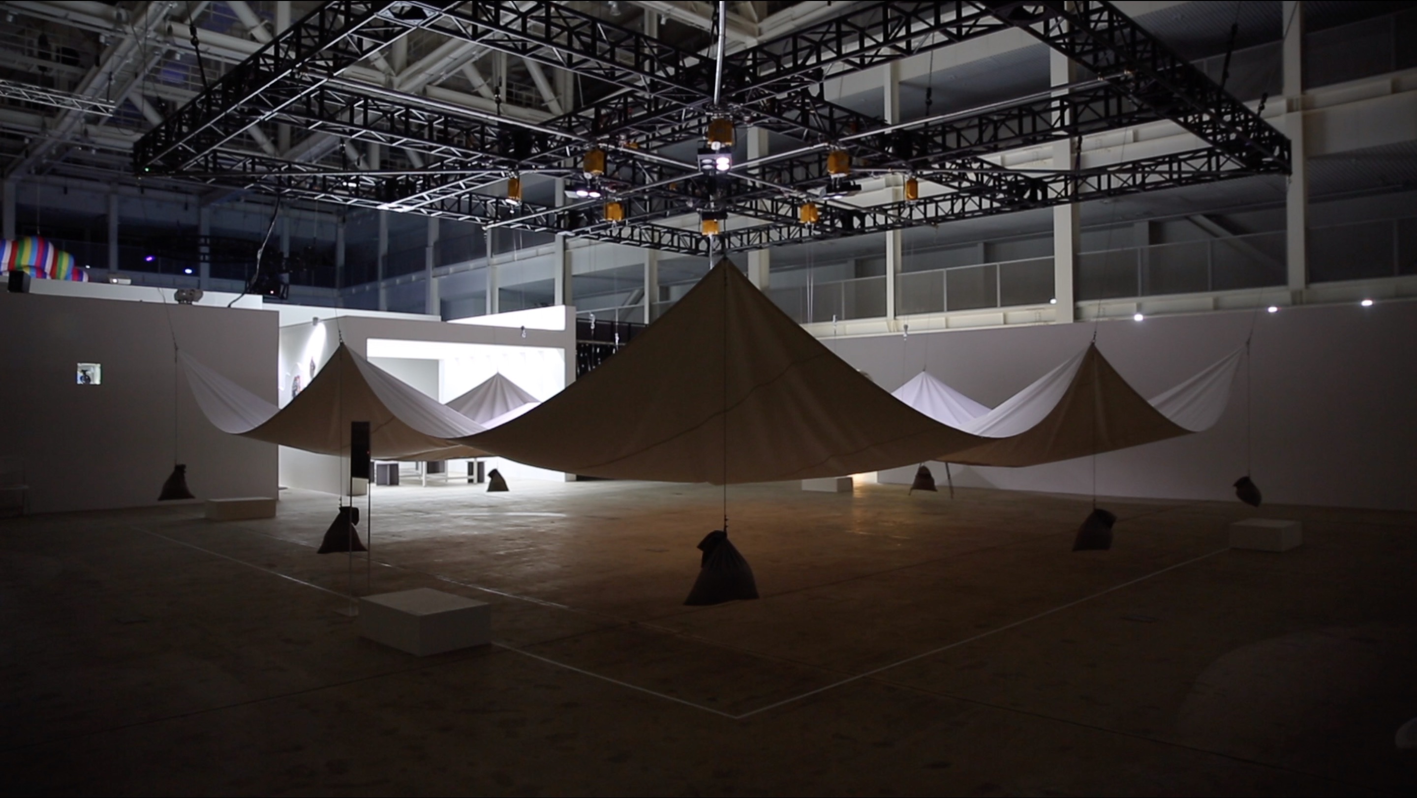 〈중력에의 의지 v2.0 Type B〉는 하얀 막 위에 금색의 덩어리, 투명한 유체가 서로 긴밀하게 연결되는 설치 작업이다. 유체는 표면 위를 유동하거나 덩어리의 표면에 붙어 새로운 배열을 만든다. 금색의 덩어리는 양감을 가진 물체로 무게감을 증폭시키고, 유체는 덩어리를 중심으로 부유하며 힘의 이동성을 드러낸다. 금색의 덩어리는 각자의 위치에서 상하로 움직이며 액체를 스치고 서로를 나누어 갖는다. 표면 아래의 움직임은 표면 위의 유체의 이동성을 불러일으켜 힘을 분배하고 공유한다. 작가는 중심의 이동을 통해 힘의 균형을 유지하며 공간을 경험하는 감각을 증폭시킨다.