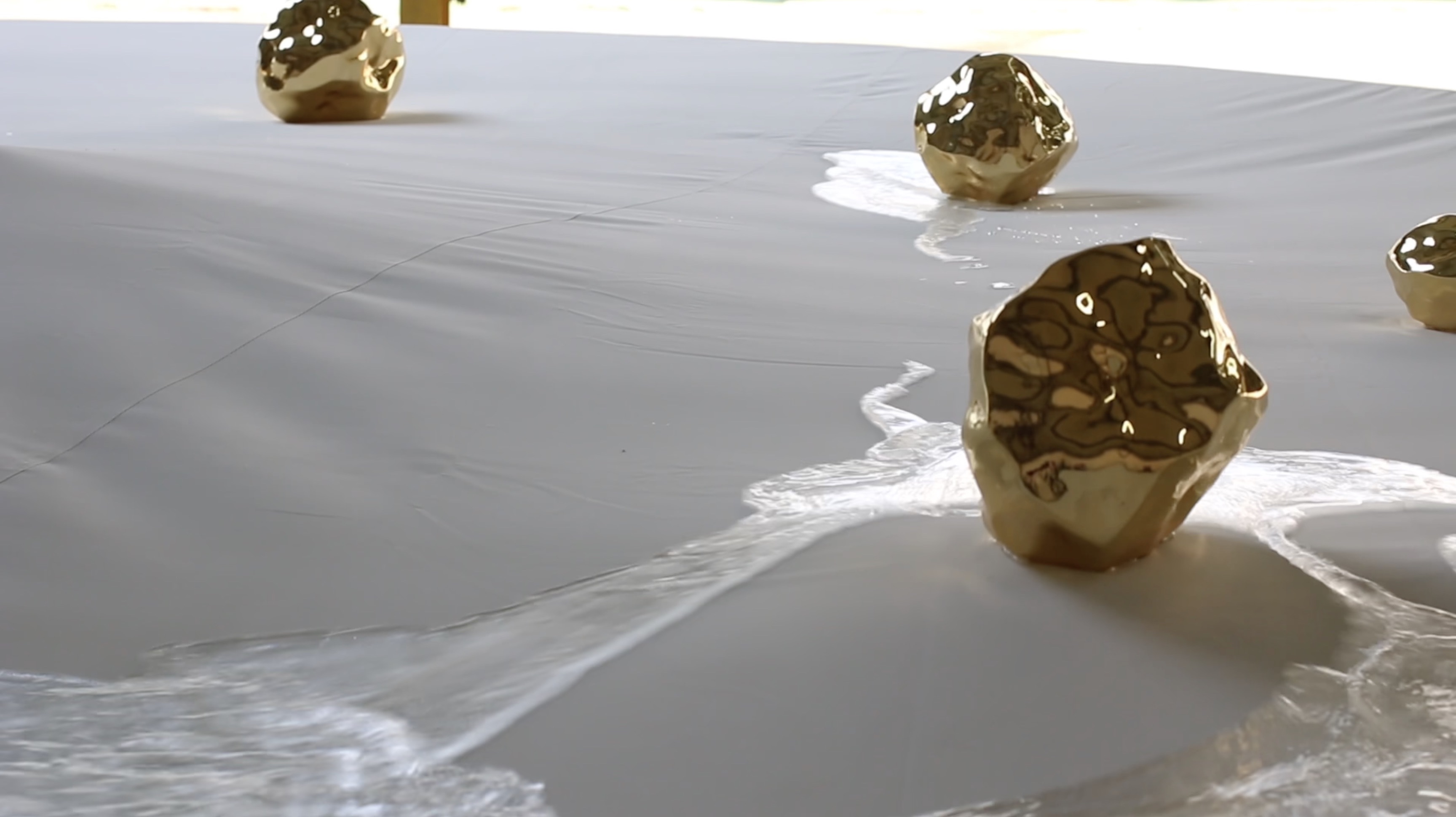 〈The Will to Gravity v2.0 Type B〉 is an installation project, closely connecting golden mass and clear fluid on a white curtain. The fluid either flows on the surface or creates a new arrangement by sticking to the mass. The golden mass, with a sense of volume, amplifies the sense of weight, and the fluid, movement centering on the mass, expresses the mobility of power. The golden masses move up and down from their position, grazing and splitting liquids. The movement under the surface causes the mobility of fluid on the surface so that the power is distributed and shared. Jung Dakd amplifies sensory experience of the space by moving the center while maintaining the balance of power. Aspects of ingredients changed by the external environment capture the landscape and daily lives around us. Through this project, he explores the uniqueness and properties of objects from the relationships between ingredients and reveals the cooperative coexistence in society by combining fluids.