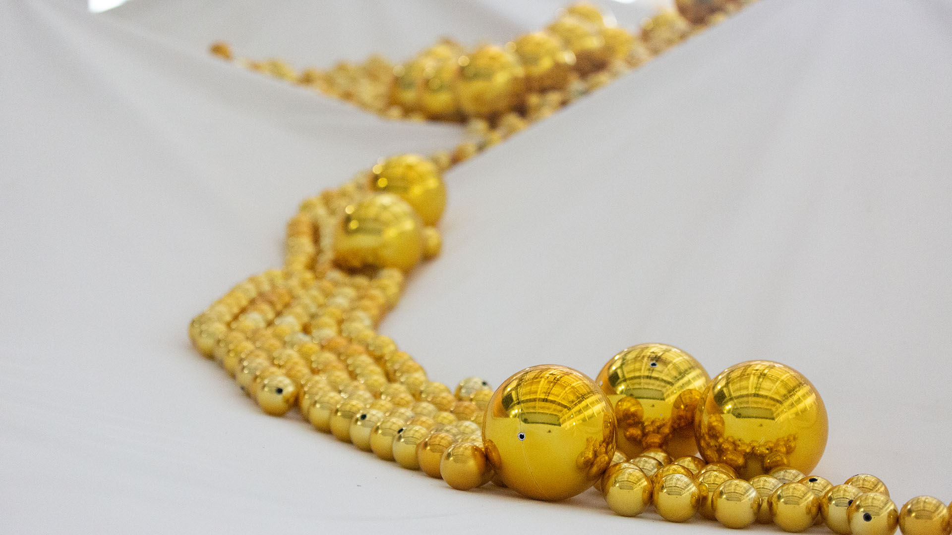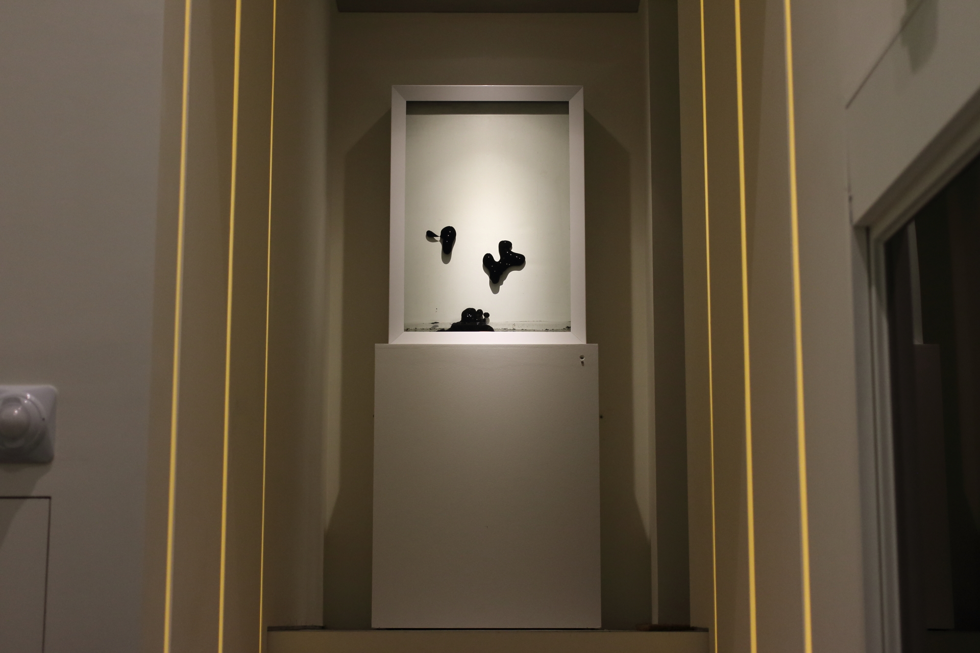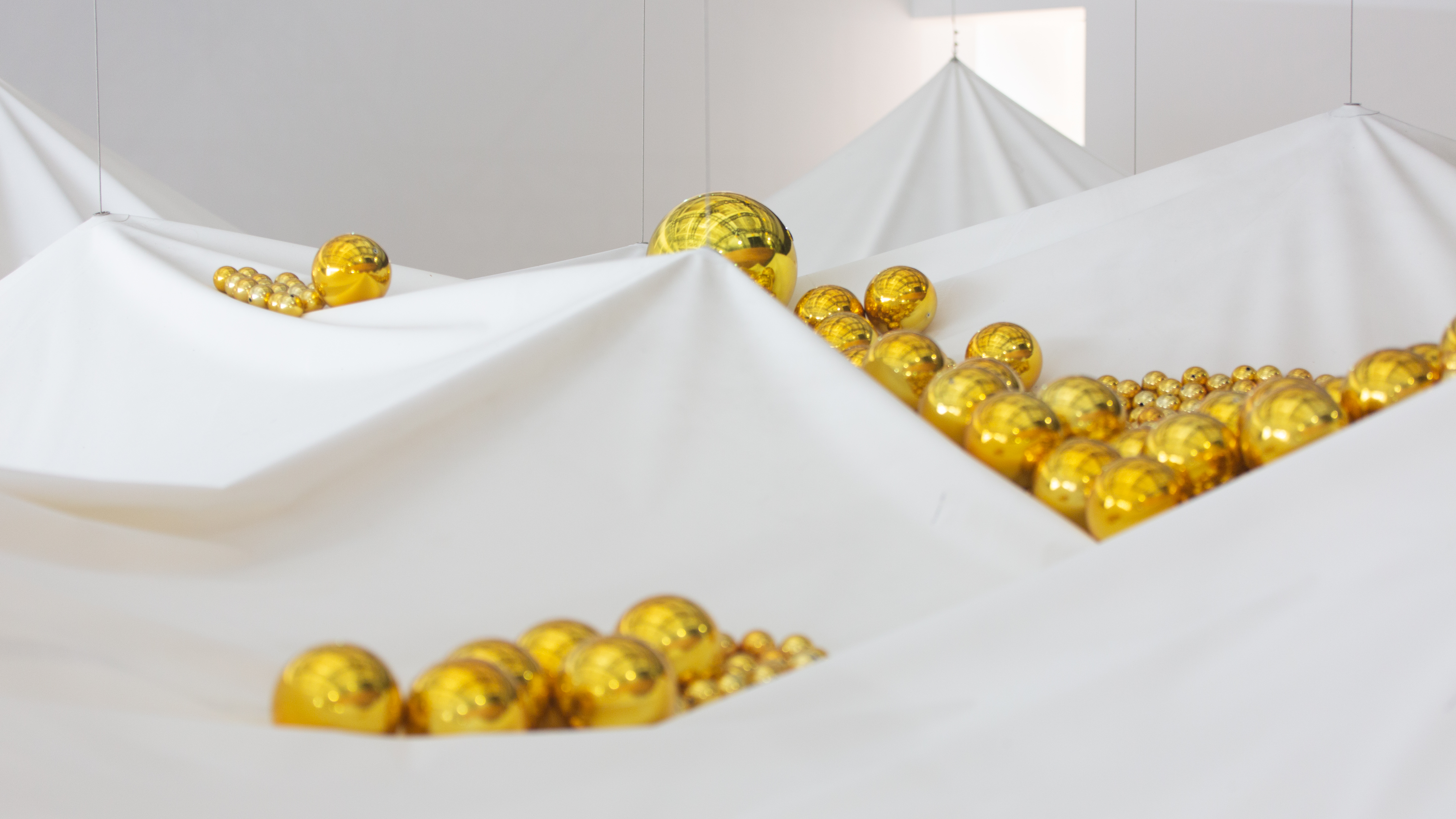〈The Will to Gravity v2.0 Type B〉 is an installation project, closely connecting golden mass and clear fluid on a white curtain. The fluid either flows on the surface or creates a new arrangement by sticking to the mass. The golden mass, with a sense of volume, amplifies the sense of weight, and the fluid, movement centering on the mass, expresses the mobility of power. The golden masses move up and down from their position, grazing and splitting liquids. The movement under the surface causes the mobility of fluid on the surface so that the power is distributed and shared. Jung Dakd amplifies sensory experience of the space by moving the center while maintaining the balance of power. Aspects of ingredients changed by the external environment capture the landscape and daily lives around us. Through this project, he explores the uniqueness and properties of objects from the relationships between ingredients and reveals the cooperative coexistence in society by combining fluids.